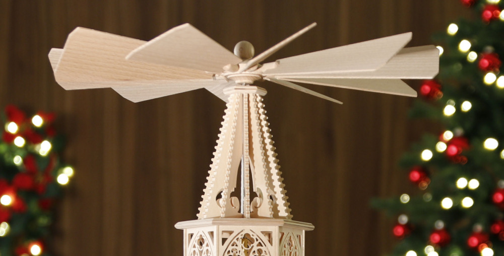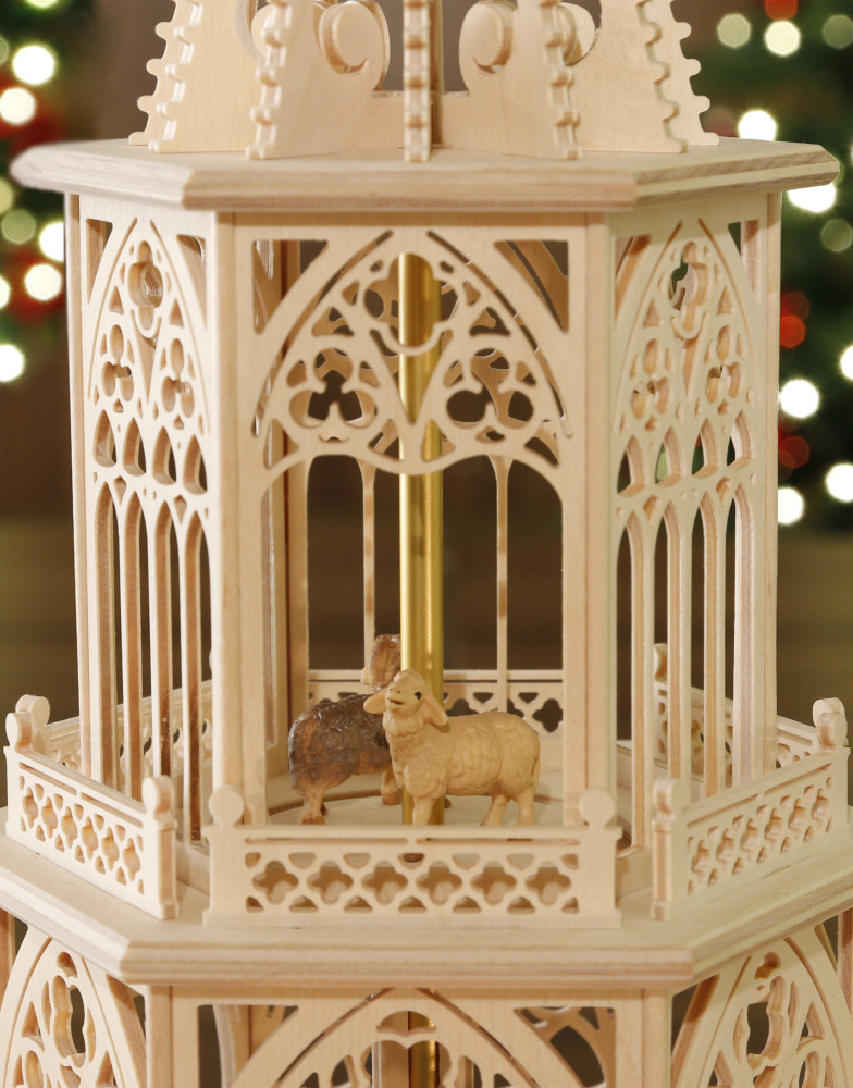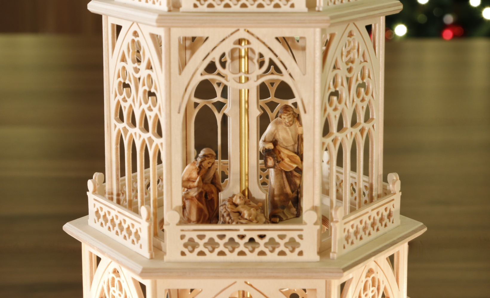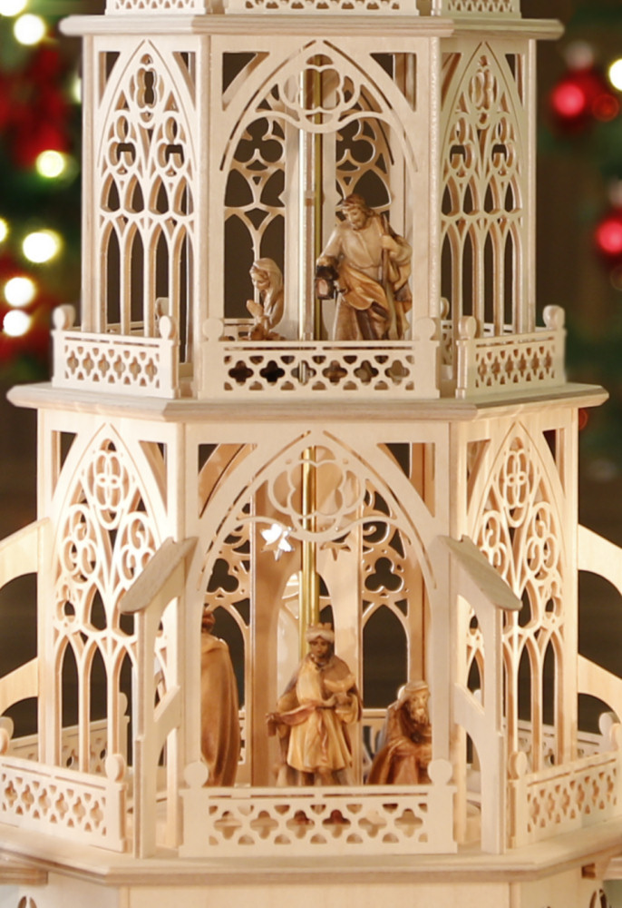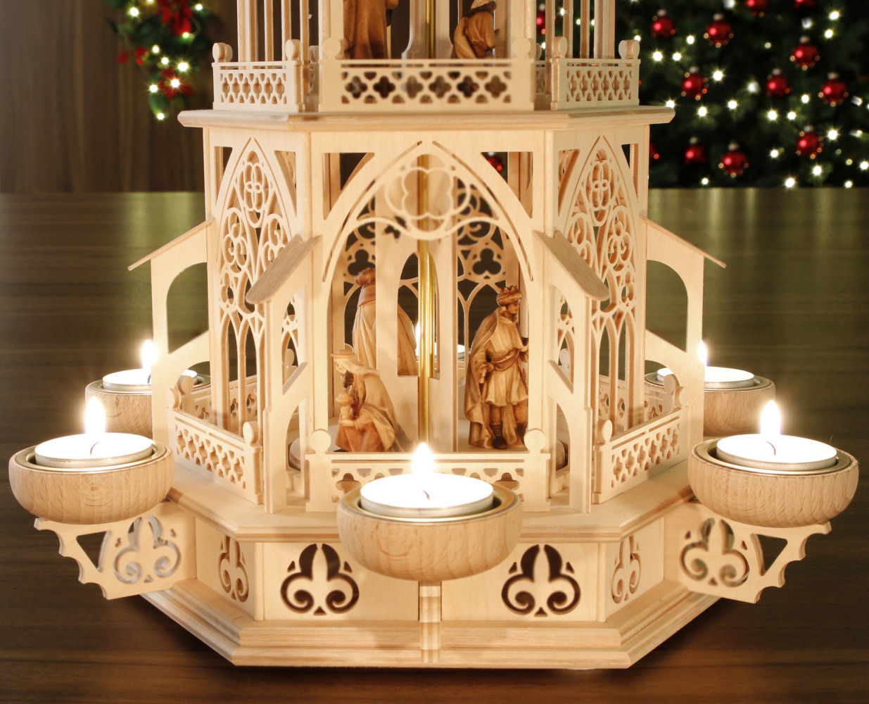 und bestückt aus dem GRÖDNER TAL in Südtirol. In dieser Tilgner-Pyramide haben wir viele Elemente der und filigraner Ausführung dargestellt. Sie reichen vom Spitzbogenfenster mit typischen Drei- und Vierpässen und schmückenden Ornamenten über die sich wiederfindenden Vierpässe die Strebepfeiler und Strebebögen sowie die im Unterbau und bis hin zur typisch schlanken Form der gesamten Pyramide. Neben jedem verzierten "Fenster-Element" gestattet ein stilisiertes offenes Portal weiten Einblick auf die prachtvollen und lieblich dezent bemalten original DOLFI-Skulpturen, geschnitzt von Bildhauermeistern des GRÖDNER TALS (mit Echtheitszertifikat) Die Figuren sind auf der Pyramide fest verleimt. - Heilige Familie im 2. Stock, - Heilige Drei Könige aus dem Morgenland im 1. Stock und - 2 niedliche Schäfchen (d.h. 1 Schäfchen und 1 Widder) im 3. Stock. Diese Pyramide ist mit 6 Teelichthaltern ausgestattet. Technische Daten der Tilgner-Pyramide: Gesamthöhe: ca. 53 cm Etagen: Unterbau + 3 Etagen, 6-eckig Flügelraddurchmesser: ca. 33 cm Teelichthalter: 6 Stück, abnehmbar und somit jederzeit wechselbar. Die aufwendige Verpackung stellt sicher, dass auf dem Transportweg nichts kaputt geht. - sofort lieferbar - Zurück zum Online-Shop | |||||||||||