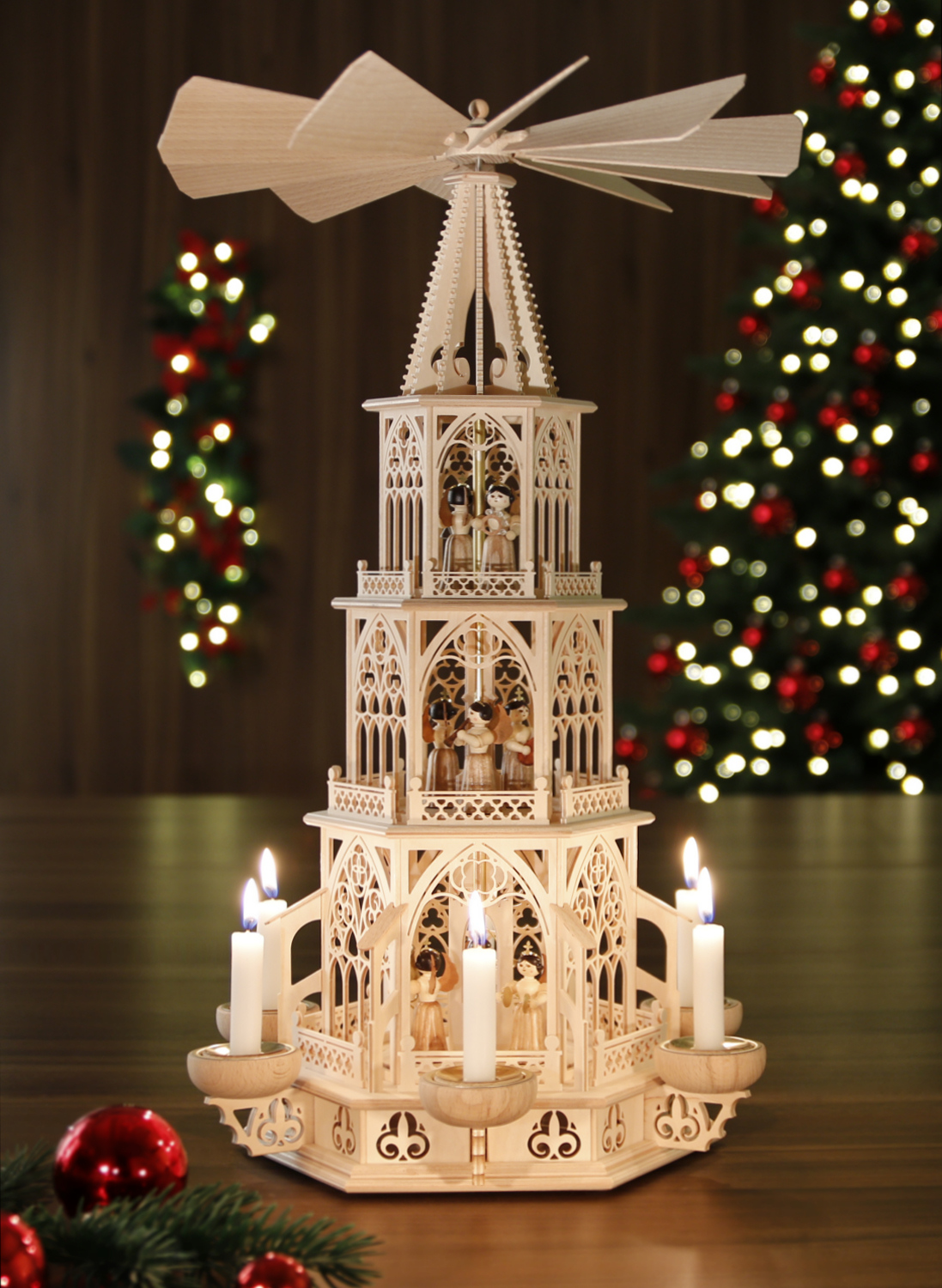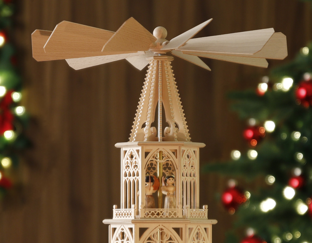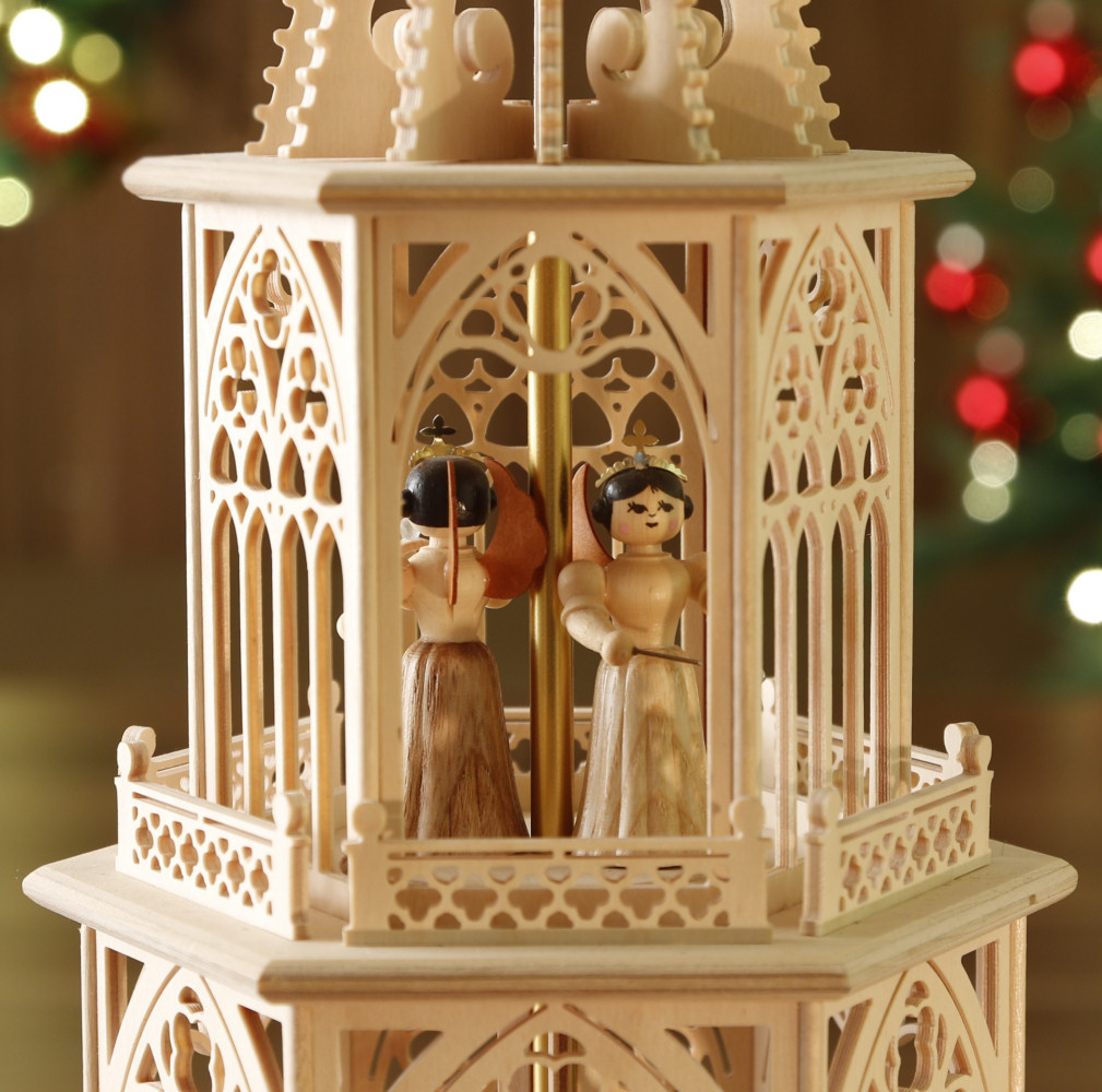 Mitten aus dem Weihnachtsland - dem Erzgebirge und aus Rothenkirchen / Sachsen. In dieser Tilgner-Pyramide haben wir viele Elemente der und filigraner Ausführung dargestellt. Sie reichen vom Spitzbogenfenster mit typischen Drei- und Vierpässen und schmückenden Ornamenten über die sich wiederfindenden Vierpässe in den "Mauerelementen", die Strebepfeiler und Strebebögen sowie die im Unterbau und in der Spitze eingearbeiteten Lilien bis hin zur typisch schlanken Form der gesamten Pyramide. Neben jedem verzierten "Fenster-Element" gestattet ein weiten Einblick auf die hübschen musizierenden Engelchen. Die Engelchen sind auf der Pyramide fest verleimt. (Die Instrumente können abweichen.) Diese Pyramide ist mit 6 Teelichthaltern + 6 Adaptern für Kerzen ausgestattet. Technische Daten der Tilgner-Pyramide: Gesamthöhe: ca. 53 cm Etagen: Unterbau + 3 Etagen, 6-eckig Flügelraddurchmesser: ca. 33 cm Die aufwendige Verpackung stellt sicher, dass auf dem Transportweg nichts kaputt geht. - sofort lieferbar - Zurück zum Online-Shop | |||||||