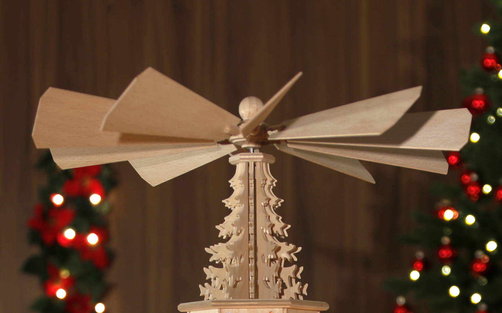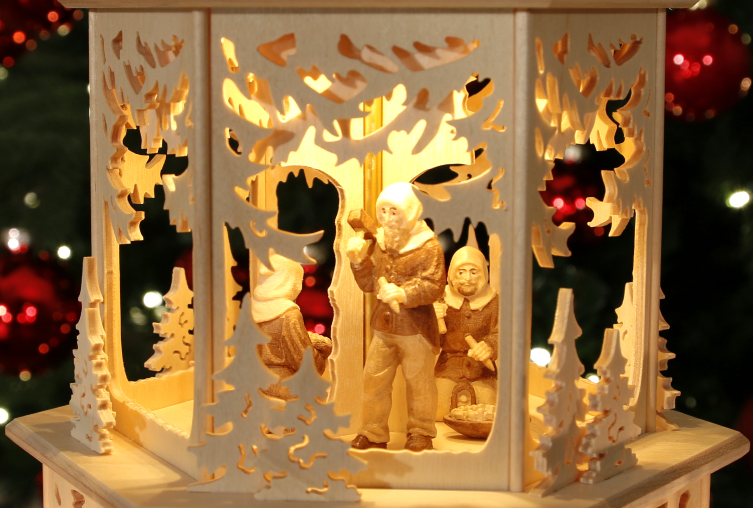 - dem Erzgebirge - und bestückt mit Original Grödner Holzschnitzerei (Fa. C.H.E. Regali / Südtirol) In unserer kleinen Werkstatt in Kurort Oberwiesenthal haben wir für Sie dieses Wald-Modell mit kleinen 3D-Effekten - einen filigranen Traum aus Holz - entwickelt und hergestellt. Diese 3-stöckige, 6-eckige Pyramide Höhe: ca. 53 cm wurde aus vielen Einzelteilen in liebevoller Handarbeit zusammengefügt. Komplettiert mit Grödner Holzschnitzerei (Bergleute in der 1. und 2. Etage), und niedlichen Häschen in der 3. Etage wird diese Pyramide die Advents- und Weihnachtszeit mit besonderer Romantik erfüllen. Die Figuren/Tiere sind auf der Pyramide fest verleimt. Technische Daten: Diese Tilgner-Pyramide verfügt über eine langlebige, energiesparende Warmton-LED-Beleuchtung in allen 3 Etagen. Sie ist mit 6 Teelichthaltern + 6 Kerzenadaptern ausgestattet, so dass die Pyramide durch die Wärme der Lichter angetrieben wird (ohne Motor!) Sind die Kerzen (oder Teelichter) aus, dreht sich die Pyramide nicht, verströmt aber durch ihre warme Beleuchtung eine wohlige Atmosphäre im Raum. Mit Steckernetzteil 12V (Eingang:230V, Ausgang:12V) Flügelraddurchmesser: ca. 33 cm Die aufwendige Verpackung stellt sicher, dass auf dem Transportweg nichts kaputt geht. - sofort lieferbar - Zurück zum Online-Shop | |||||||||