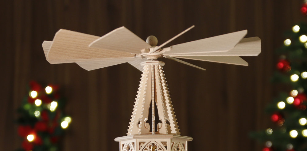 und bestückt aus Kurort Seiffen/Erzgebirge In dieser Tilgner-Pyramide haben wir viele Elemente der und filigraner Ausführung dargestellt. Sie reichen vom Spitzbogenfenster mit typischen Drei- und Vierpässen und schmückenden Ornamenten über die sich wiederfindenden Vierpässe die Strebepfeiler und Strebebögen sowie die im Unterbau und bis hin zur typisch schlanken Form der gesamten Pyramide. Die Figuren sind auf der Pyramide fest verleimt. - Heilige Familie im 2. Stock, - Heilige Drei Könige aus dem Morgenland im 1. Stock und - Schäfer mit Schäfchen im 3. Stock. Diese Pyramide ist mit 6 Teelichthaltern + 6 Adapter für Kerzen ausgestattet. Technische Daten der Tilgner-Pyramide: Gesamthöhe: ca. 53 cm Etagen: Unterbau + 3 Etagen, 6-eckig Flügelraddurchmesser: ca. 33 cm Teelichthalter: 6 Stück + Adapter für Kerzen Die aufwendige Verpackung stellt sicher, dass auf dem Transportweg nichts kaputt geht. - sofort lieferbar - Zurück zum Online-Shop | |||||||||