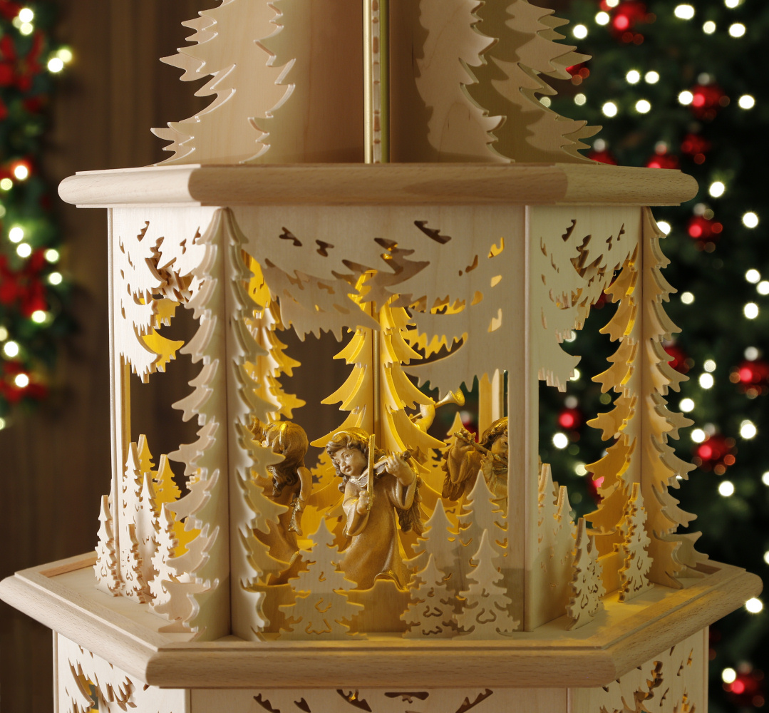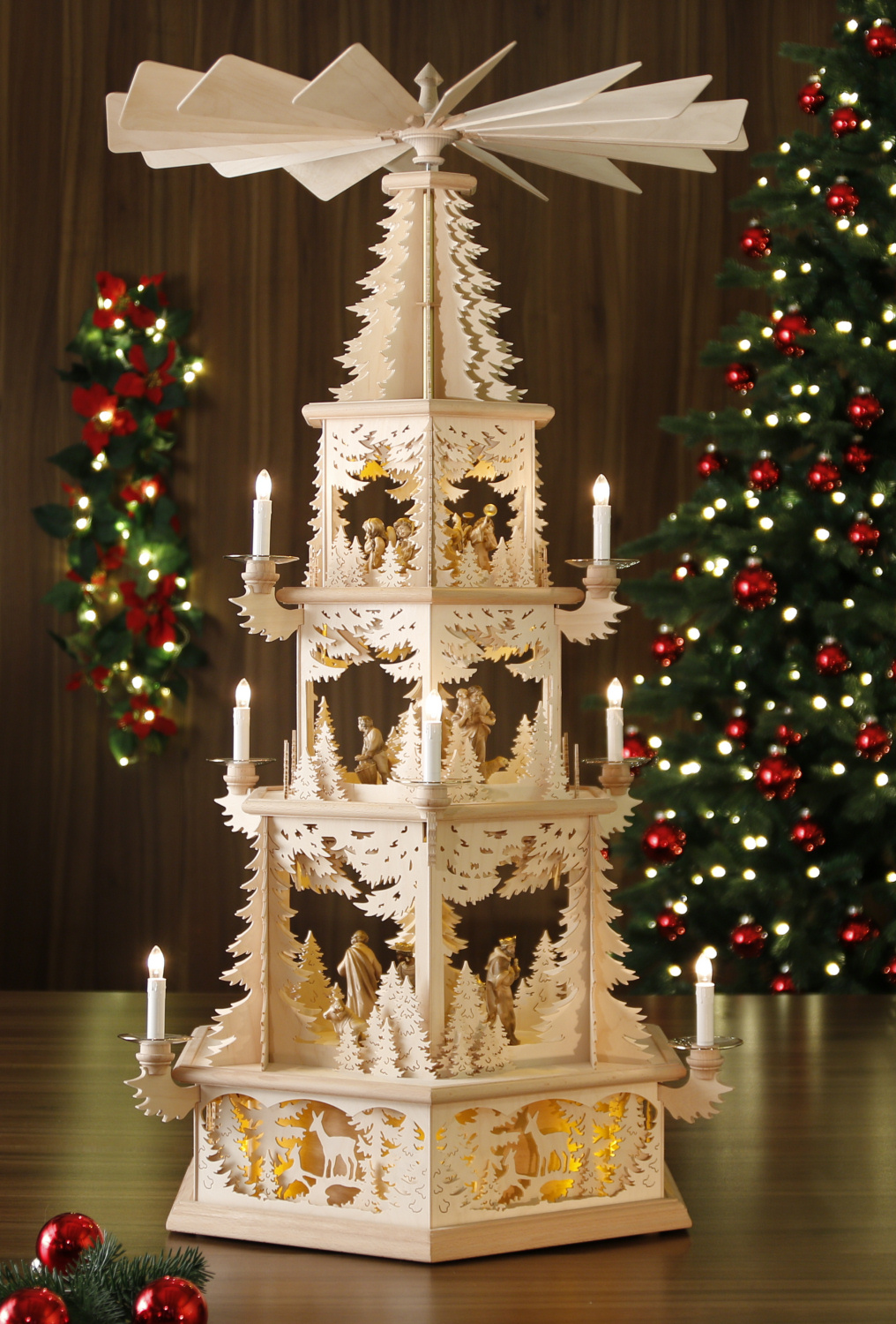 Mitten aus dem Weihnachtsland - dem Erzgebirge In unserer Pyramidenwerkstatt Tilgner entwickelten wir für Sie diese Weihnachtspyramide „Waldidyll“ mit einer Höhe von ca. 1,07 m Flügelraddurchmesser: ca. 62cm. Wir haben versucht, die Romantik der Wälder, stilisiert aus naturbelassenem Birkenschichtholz, darzustellen. Bitte betrachten Sie die vielen 3-D-Effekte! Schon die vielen Bäumchen im Außenbereich laden den Betrachter ein, sich das Gesamtkunstwerk, das in liebevoller Handarbeit zusammengefügt wurde, näher anzuschauen. Viele prachtvolle Krippenfiguren der Fa. SALCHER aus dem Grödnertal ergänzen diese wunderhübsche Pyramide: Christi Geburt, Ochs und Esel und die Heiligen drei Könige drehen sich auf dem Teller im 1. Stock, Hirten, Schäfchen und Ziegen bewegen sich im Innenbereich des 2. Stockes, 4 liebliche Engel musizieren im 3. Stock. Alle Figuren und Tiere sind auf der Pyramide fest verleimt! Diese elektrische Tilgner Weihnachtspyramide verströmt durch ihre warme Innenbeleuchtung eine wohlige Atmosphäre im Raum! Sie verfügt über eine langlebige, energiesparende Warmton-LED-Beleuchtung im Unterbau und in allen 3 Etagen. Im Außenbereich ist die Pyramide mit 9 elektrischen Kerzen ausgestattet. Sie wird mit einem Motor angetrieben. Mit Steckernetzteil 12Vac. Ein Fußschalter ist im Lieferumfang enthalten. Die aufwendige Verpackung stellt sicher, dass auf dem Transportweg nichts kaputt geht. - leider ausverkauft - Zurück zum Online-Shop | ||||||||||