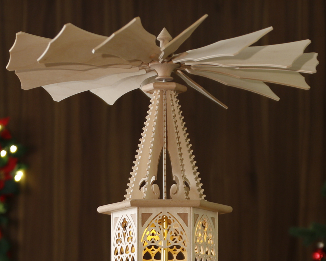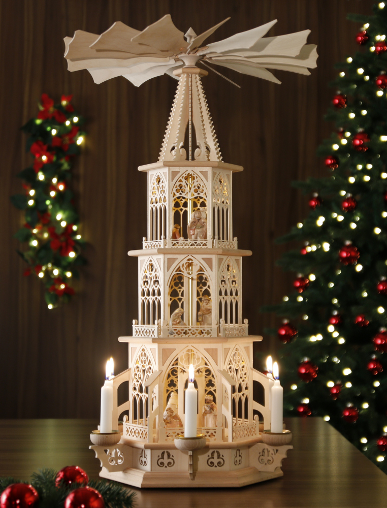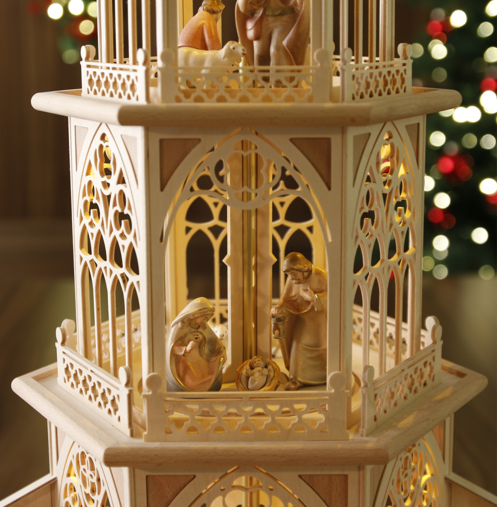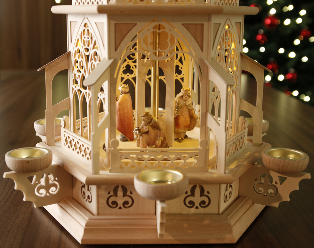 Mitten aus dem Weihnachtsland - dem Erzgebirge und bestückt mit prachtvoll geschnitzten original PEMA-Krippenfiguren aus dem GRÖDNERTAL. In dieser Tilgner-Pyramide haben wir viele Elemente der Stil-Epoche "Gotik" in Miniatur und filigraner Ausführung dargestellt. Sie reichen vom Spitzbogenfenster mit typischen Drei- und Vierpässen und schmückenden Ornamenten über die sich wiederfindenden Vierpässe in den "Mauerelementen", die Strebepfeiler und Strebebögen sowie die im Unterbau und in der Spitze eingearbeiteten Lilien bis hin zur typisch schlanken Form der gesamten Pyramide. Neben jedem verzierten "Fenster-Element" gestattet ein stilisiertes offenes Portal weiten Einblick auf die prachtvollen und lieblich dezent bemalten Original PEMA-Krippenfiguren (mit Echtheitszertifikat) Die Figuren sind auf der Pyramide fest verleimt. In allen Pyramidenseitenteilen haben wir, in Anlehnung an eine Intarsienarbeit, farblich abgesetzte Buchenfurnier-Ecken eingearbeitet. Mit ihrer Höhe von 83 cm (Flügelraddurchmesser: ca. 48 cm) hat diese Pyramide die perfekte Größe für jeden Wohnraum. Diese Tilgner Weihnachtspyramide verfügt über eine langlebige, energiesparende Warmton-LED-Beleuchtung in allen 3 Etagen, hat im Außenbereich 6 Kerzenhaltereinsätze, die in Teelichthaltern eingesetzt sind , so dass die Pyramide durch diese Kerzen (oder auch Teelichter) angetrieben wird (ohne Motor!). Sind die Kerzen aus, dreht sich diese Pyramide also nicht, verströmt aber durch ihre warme Etagenbeleuchtung eine wohlige Atmosphäre im Raum. mit Steckernetzteil 12V (Eingang: 230 V, Ausgang: 12V) Die aufwendige Verpackung stellt sicher, dass auf dem Transportweg nichts kaputt geht. - leider ausverkauft - Zurück zum Online-Shop | |||||||||||