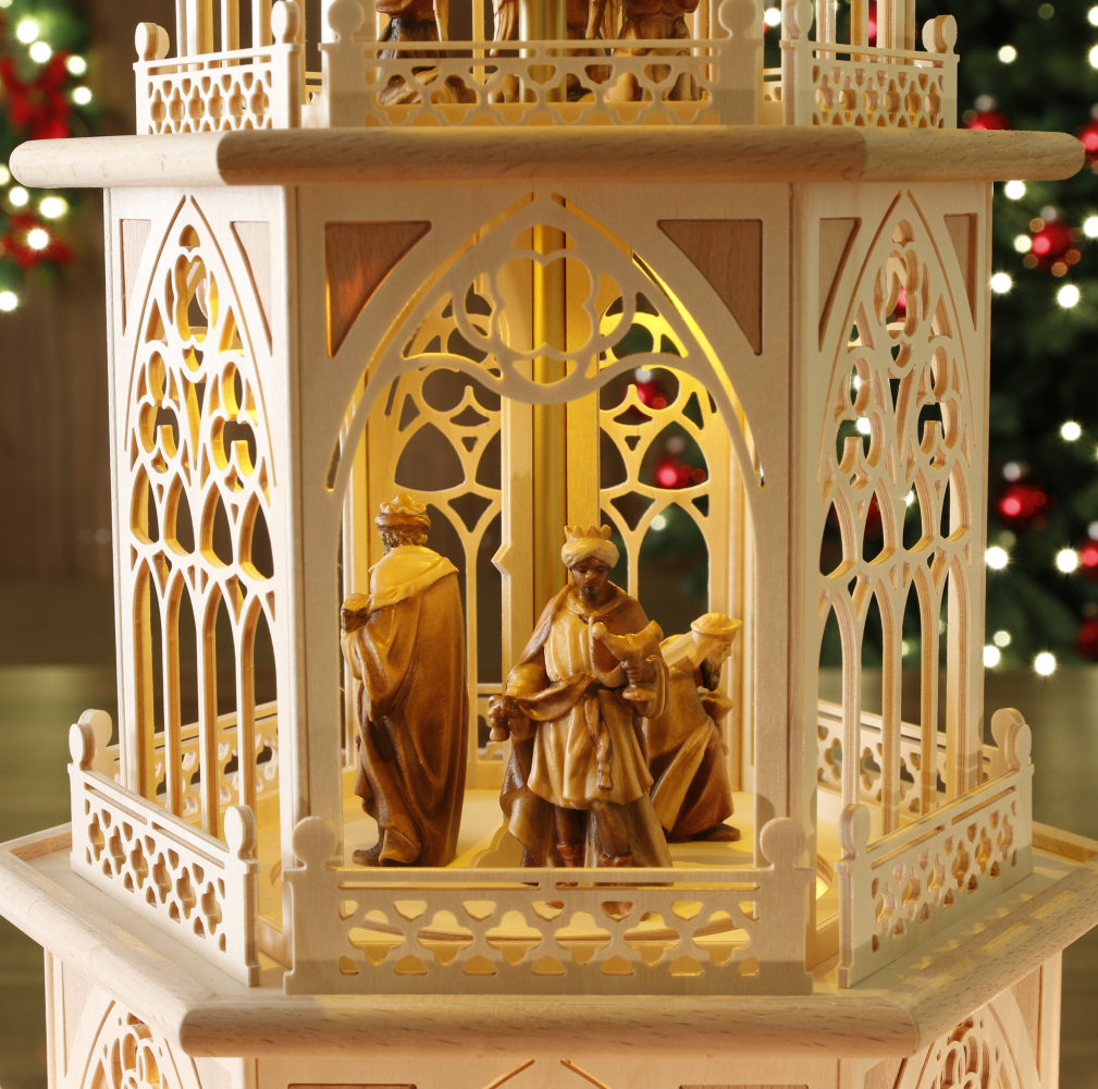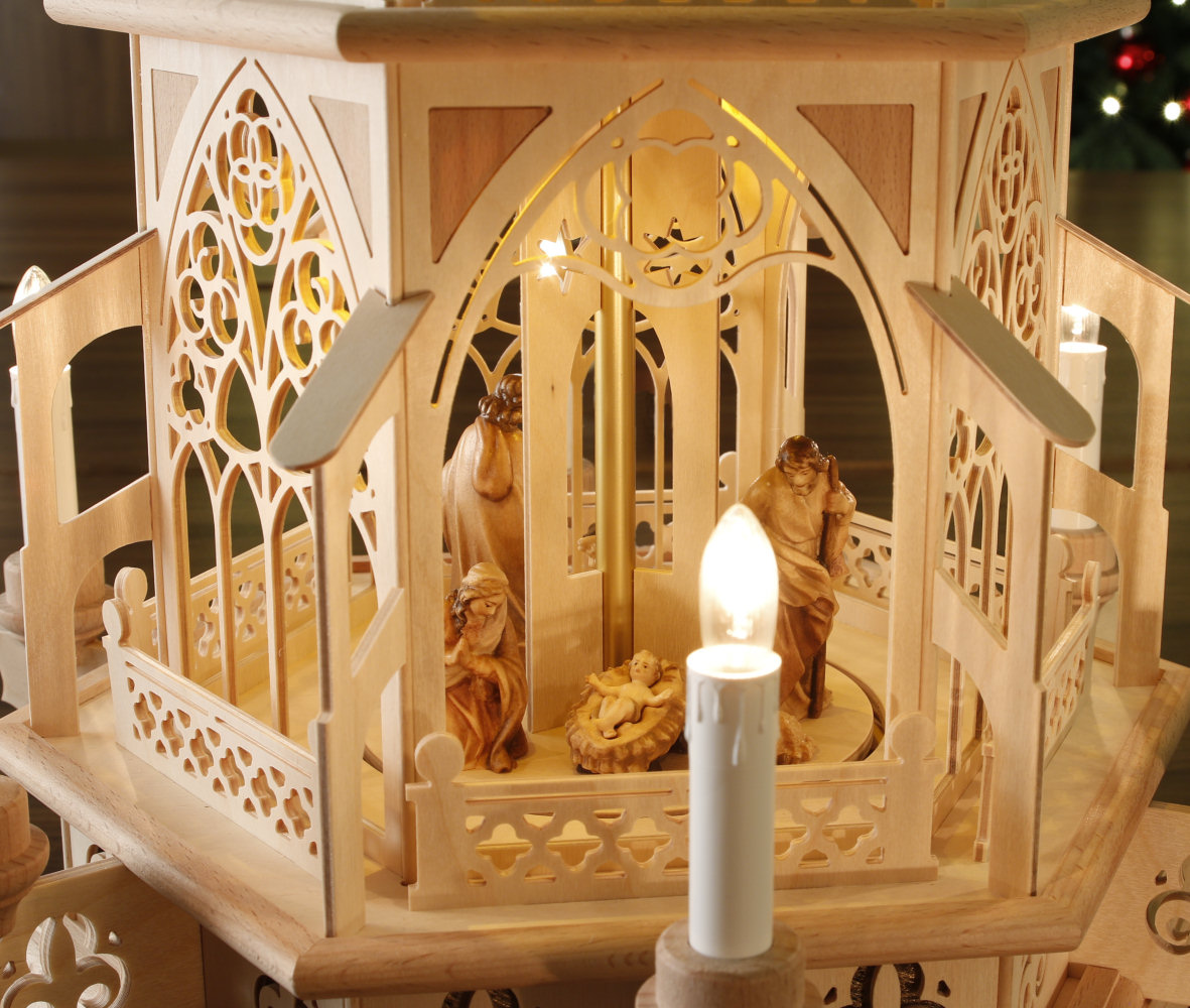Mitten aus dem Weihnachtsland - dem Erzgebirge und bestückt mit prachtvoll geschnitzten original DOLFI-Krippenfiguren aus dem GRÖDNERTAL. In dieser Tilgner-Pyramide haben wir viele Elemente der Stil-Epoche "Gotik" in Miniatur und filigraner Ausführung dargestellt. Sie reichen vom Spitzbogenfenster mit typischen Drei- und Vierpässen und schmückenden Ornamenten über die sich wiederfindenden Vierpässe in den "Mauerelementen", die Strebepfeiler und Strebebögen sowie die im Unterbau und in der Spitze eingearbeiteten Lilien bis hin zur typisch schlanken Form der gesamten Pyramide. Neben jedem verzierten "Fenster-Element" gestattet ein stilisiertes offenes Portal weiten Einblick auf die prachtvollen und lieblich bemalten Original DOLFI-Krippenfiguren (mit Echtheitszertifikat) Die Figuren sind auf der Pyramide fest verleimt. In allen Pyramidenseitenteilen haben wir, in Anlehnung an eine Intarsienarbeit, farblich abgesetzte Buchenfurnier-Ecken eingearbeitet. Mit ihrer Höhe von 83 cm (Flügelraddurchmesser: ca. 48 cm) hat diese Pyramide die perfekte Größe für jeden Wohnraum. Diese elektrische Tilgner Weihnachtspyramide verströmt durch ihre warme Innenbeleuchtung eine wohlige Atmosphäre im Raum! Sie verfügt über eine sehr langlebige, energiesparende Warmton-LED-Beleuchtung in allen 3 Etagen, hat im Außenbereich 6 elektrische Kerzen und wird mit einem Motor angetrieben. Mit integriertem Netzteil 12V (Eingang: 230V, Ausgang: 12V) Ein Fußschalter ist im Lieferumfang enthalten. Die aufwendige Verpackung stellt sicher, dass auf dem Transportweg nichts kaputt geht. - leider ausverkauft - Zurück zum Online-Shop | |||||||||||