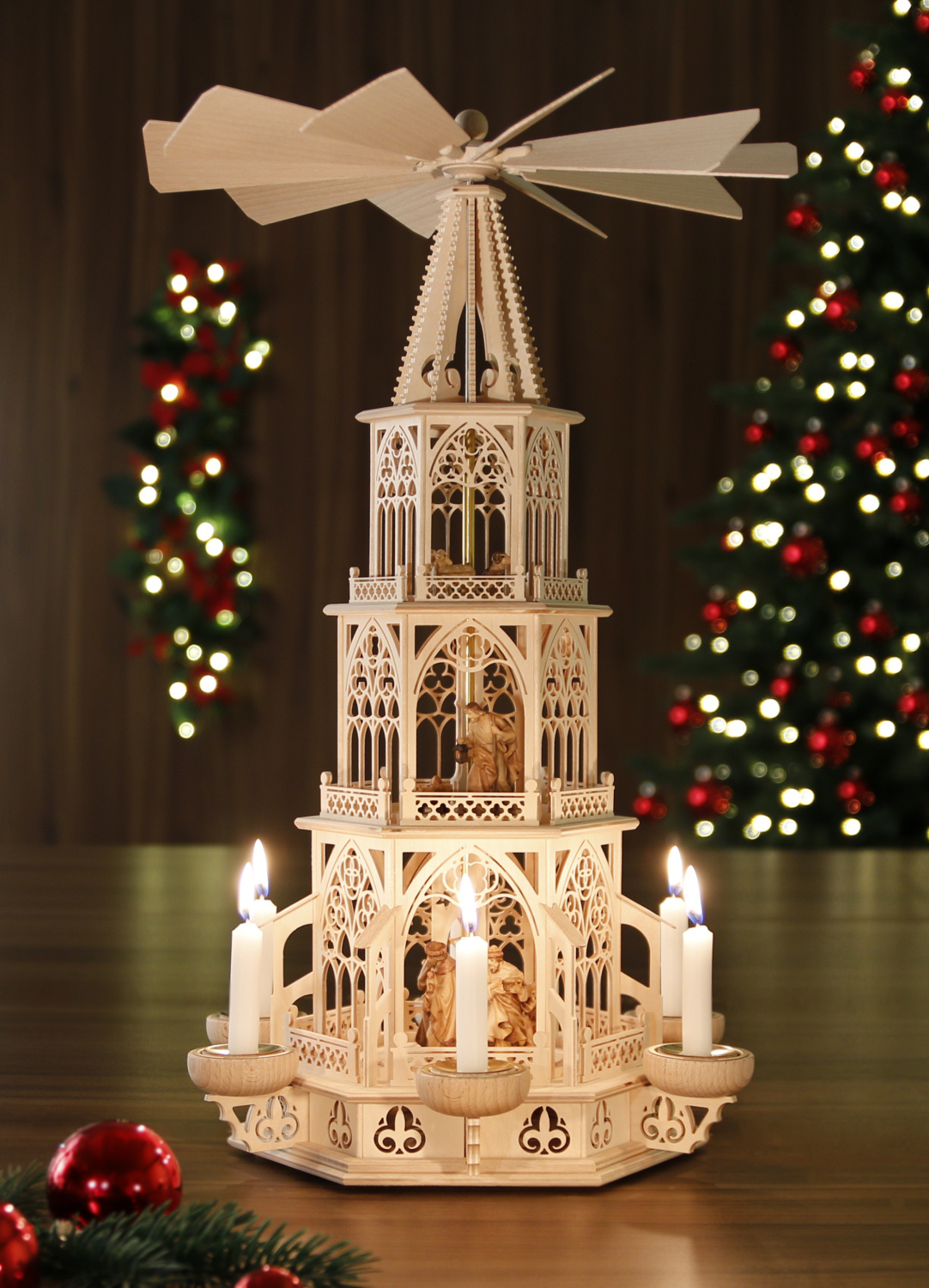 und bestückt aus dem GRÖDNERTAL in Südtirol. In dieser Tilgner-Pyramide haben wir viele Elemente der und filigraner Ausführung dargestellt. Sie reichen vom Spitzbogenfenster mit typischen Drei- und Vierpässen und schmückenden Ornamenten über die sich wiederfindenden Vierpässe die Strebepfeiler und Strebebögen sowie die im Unterbau und bis hin zur typisch schlanken Form der gesamten Pyramide. Neben jedem verzierten "Fenster-Element" gestattet ein stilisiertes offenes Portal weiten Einblick auf die prachtvollen und lieblich dezent bemalten original DOLFI-Skulpturen von Bildhauermeistern des GRÖDNER TALS (mit Echtheitszertifikat) Die Figuren sind auf der Pyramide fest verleimt. - Heilige Familie im 2. Stock, - Heilige Drei Könige aus dem Morgenland im 1. Stock und - 2 niedliche Schäfchen (d.h. 1 Schäfchen und 1 Widder) im 3. Stock. Diese Pyramide ist mit 6 Teelichthaltern + 6 Adaptern für Kerzen ausgestattet. Technische Daten der Tilgner-Pyramide: Gesamthöhe: ca. 53 cm Etagen: Unterbau + 3 Etagen, 6-eckig Flügelraddurchmesser: ca. 33 cm Die aufwendige Verpackung stellt sicher, dass auf dem Transportweg nichts kaputt geht. - sofort lieferbar - Zurück zum Online-Shop | |||||||||||