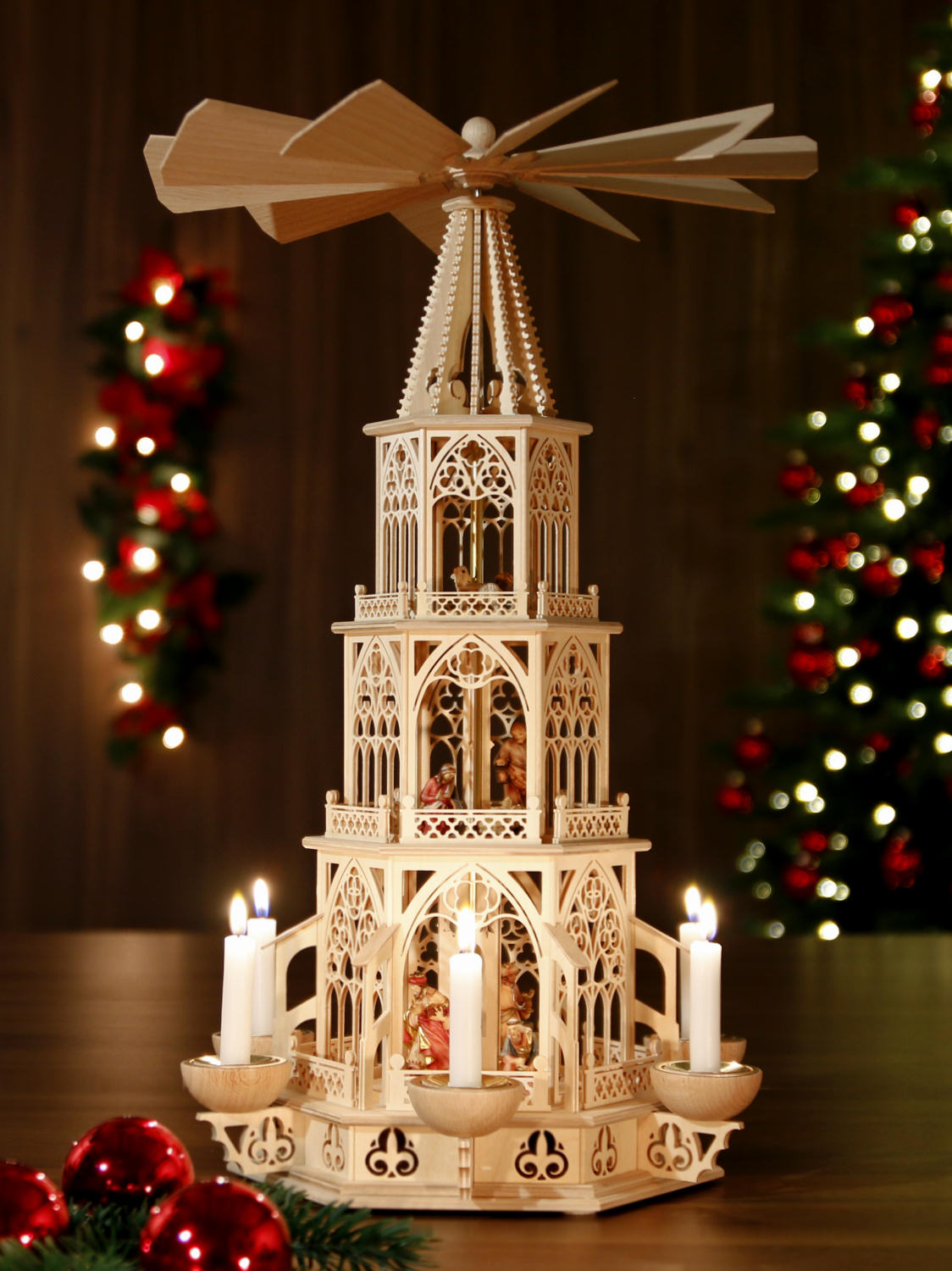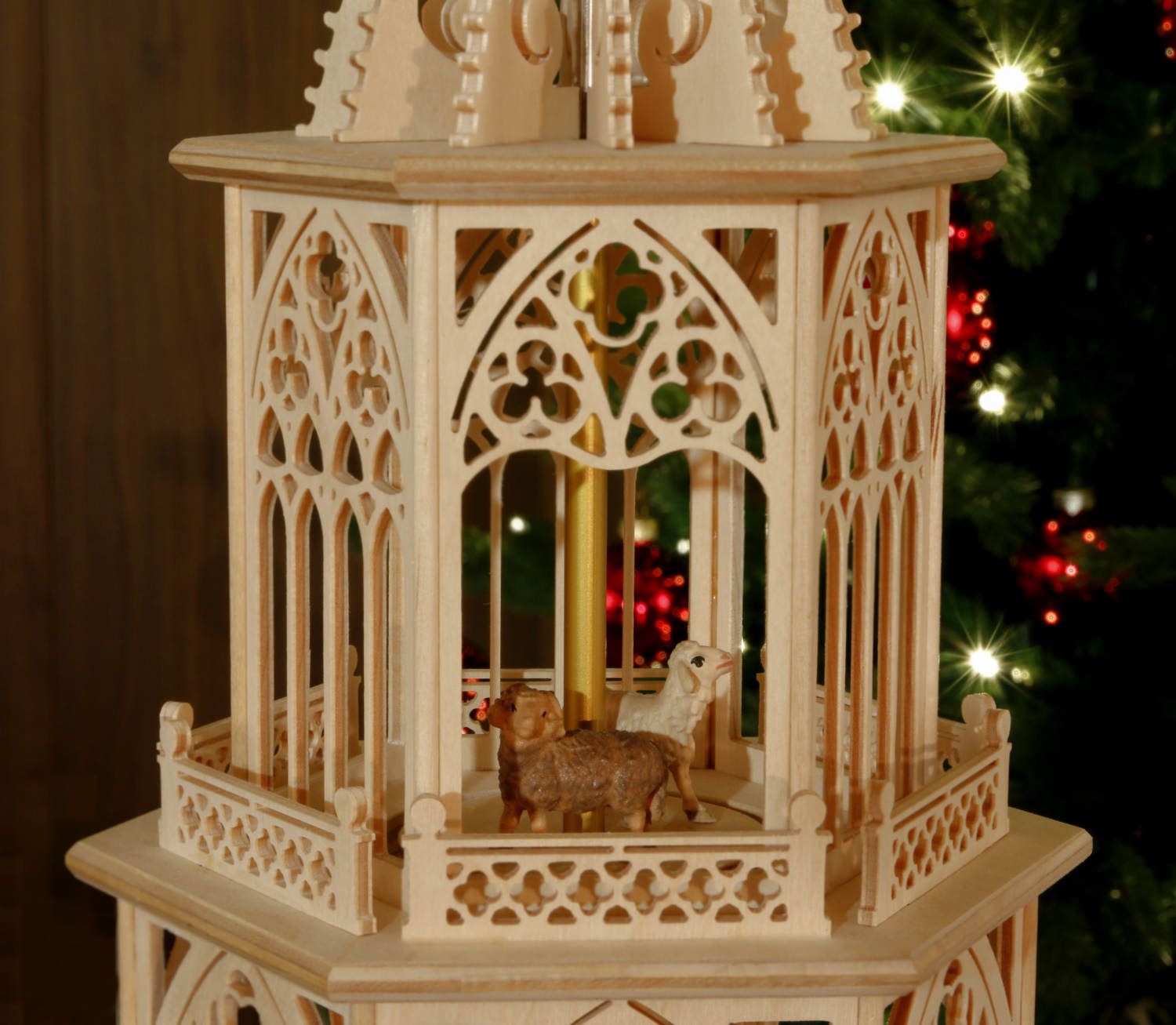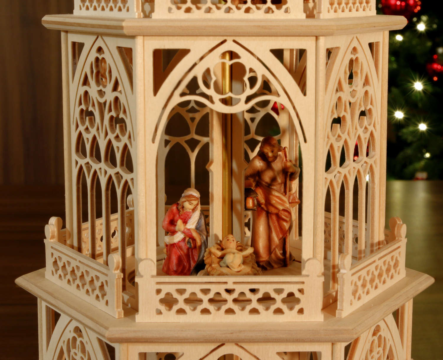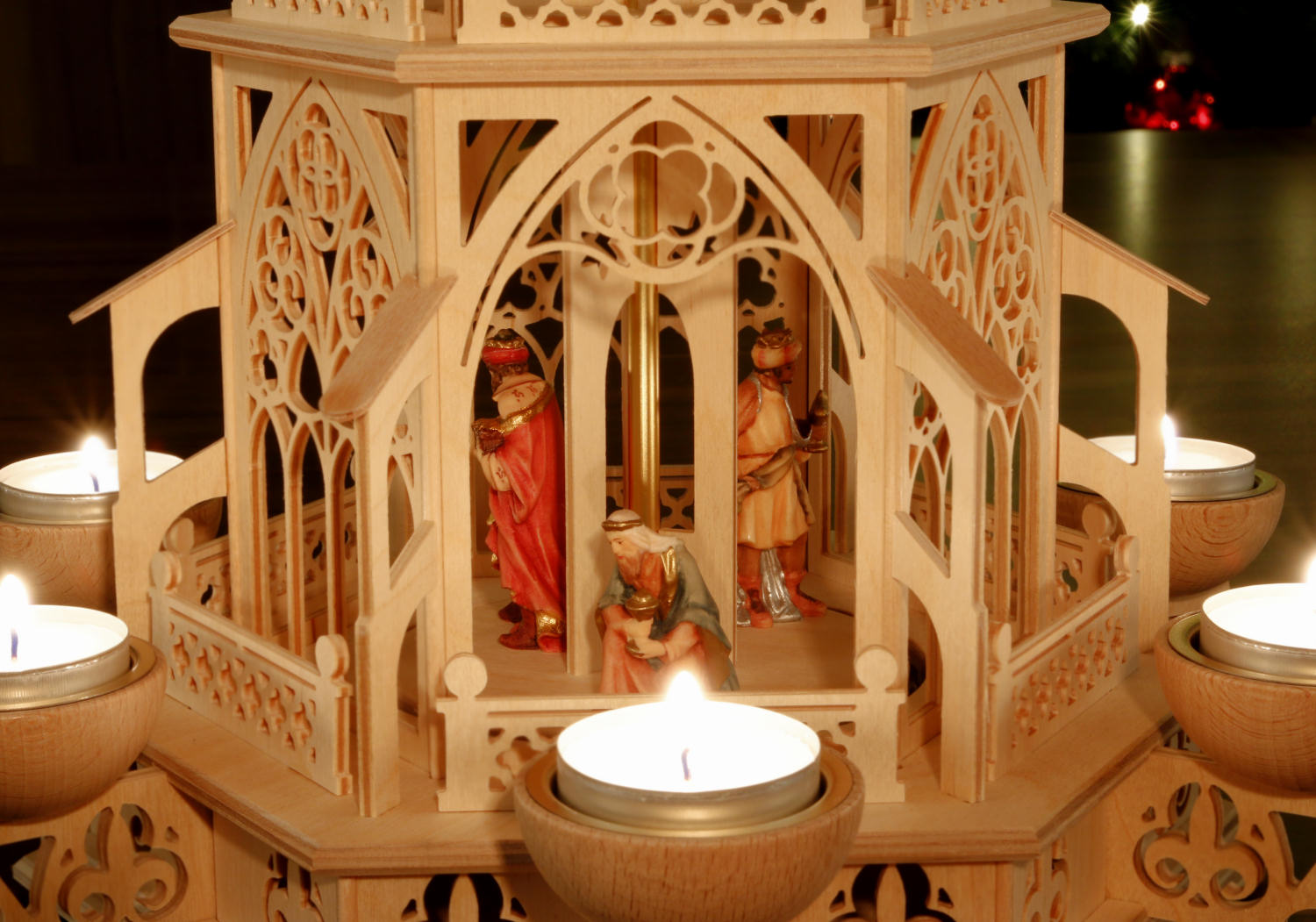 und bestückt aus dem GRÖDNERTAL in Südtirol. In dieser Tilgner-Pyramide haben wir viele Elemente der und filigraner Ausführung dargestellt. Sie reichen vom Spitzbogenfenster mit typischen Drei- und Vierpässen und schmückenden Ornamenten über die sich wiederfindenden Vierpässe die Strebepfeiler und Strebebögen sowie die im Unterbau und bis hin zur typisch schlanken Form der gesamten Pyramide. Neben jedem verzierten "Fenster-Element" gestattet ein stilisiertes offenes Portal weiten Einblick auf die prachtvollen und bunt bemalten original DOLFI-Skulpturen von Bildhauermeistern des GRÖDNER TALS (mit Echtheitszertifikat) Die Figuren sind auf der Pyramide fest verleimt. - Heilige Familie im 2. Stock, - Heilige Drei Könige aus dem Morgenland im 1. Stock und - 2 niedliche Schäfchen (d.h. 1 Schäfchen und 1 Widder) im 3. Stock. Diese Pyramide ist mit 6 Teelichthaltern + 6 Adaptern für Kerzen ausgestattet. Technische Daten der Tilgner-Pyramide: Gesamthöhe: ca. 53 cm Etagen: Unterbau + 3 Etagen, 6-eckig Flügelraddurchmesser: ca. 33 cm Die aufwendige Verpackung stellt sicher, dass auf dem Transportweg nichts kaputt geht. - sofort lieferbar - Zurück zum Online-Shop | |||||||||||