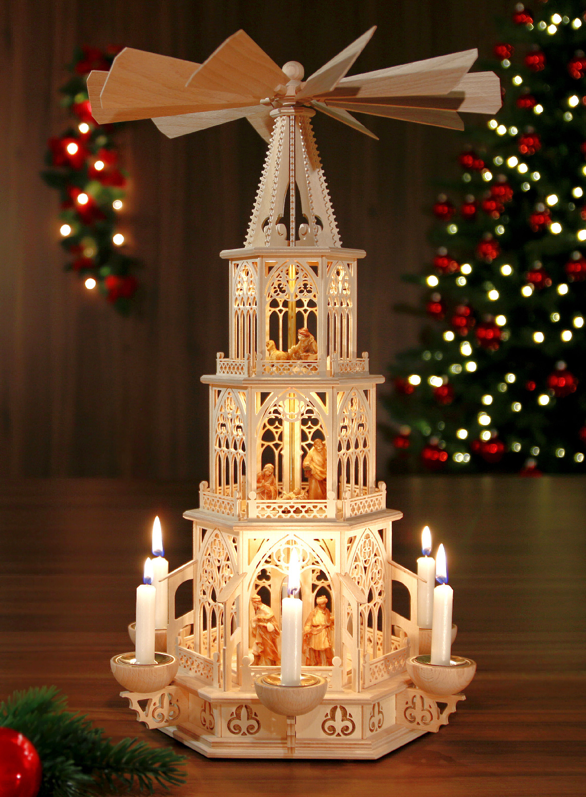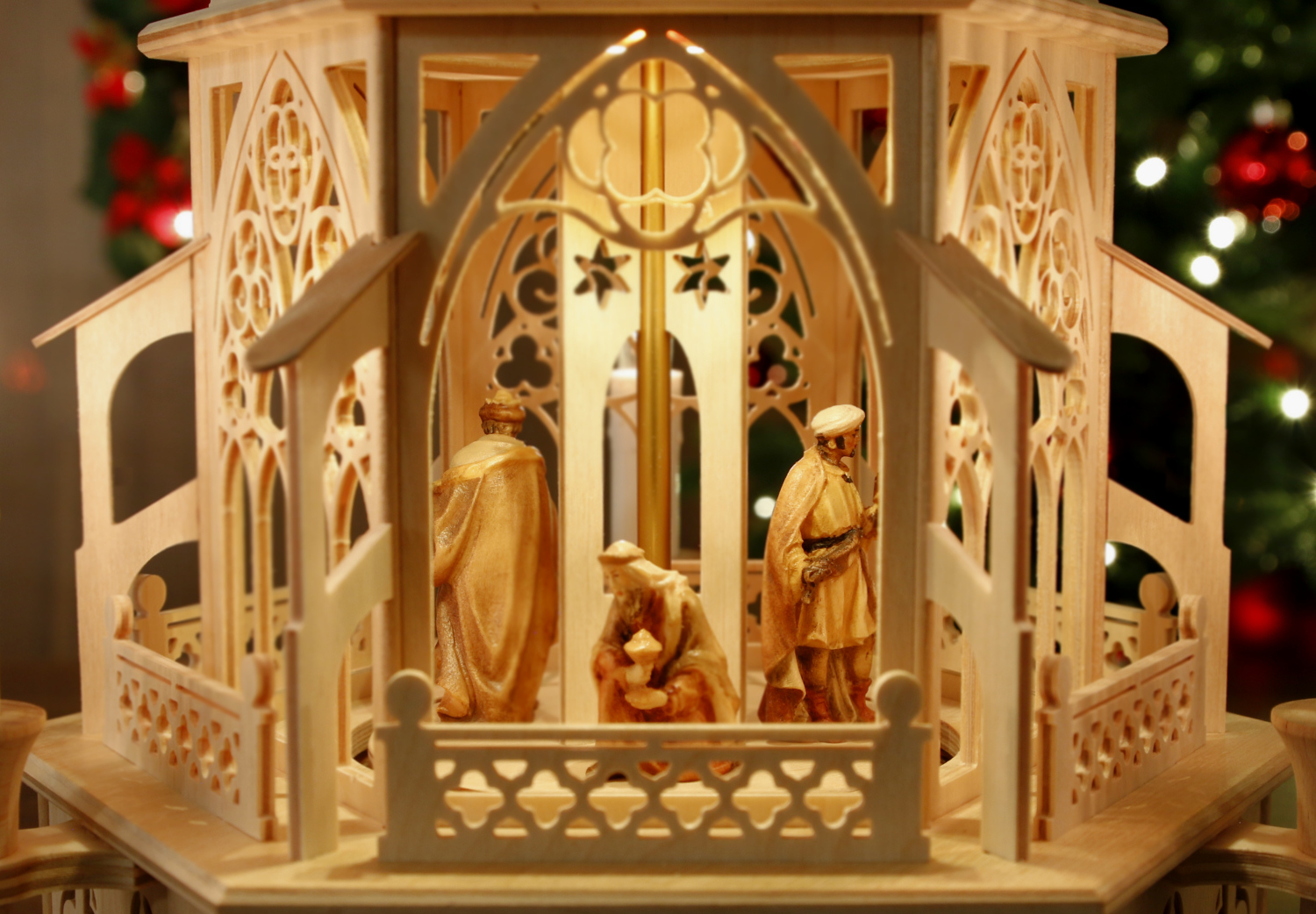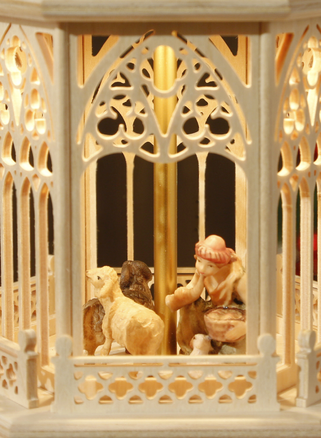 und bestückt aus dem GRÖDNER TAL in Südtirol. In dieser Tilgner-Pyramide haben wir viele Elemente der und filigraner Ausführung dargestellt. Sie reichen vom Spitzbogenfenster mit typischen Drei- und Vierpässen und schmückenden Ornamenten über die sich wiederfindenden Vierpässe die Strebepfeiler und Strebebögen sowie die im Unterbau und bis hin zur typisch schlanken Form der gesamten Pyramide. Neben jedem verzierten "Fenster-Element" gestattet ein stilisiertes offenes Portal weiten Einblick auf die prachtvollen und lieblich dezent bemalten original DOLFI-Skulpturen, geschnitzt von Bildhauermeistern des GRÖDNER TALS (mit Echtheitszertifikat) Die Figuren sind auf der Pyramide fest verleimt. - Heilige Familie im 2. Stock, - Heilige Drei Könige aus dem Morgenland im 1. Stock und - 1 Schäfer mit Schäfchen und Widder im 3. Stock. Technische Daten: Gesamthöhe: ca. 53 cm Diese Tilgner Weihnachtspyramide verfügt über eine langlebige, energiesparende Warmton-LED-Beleuchtung in allen 3 Etagen. Sie ist mit 6 Teelichthaltern + 6 Adapter für Kerzen ausgestattet, so dass die Pyramide durch die Wärme der Lichter angetrieben wird (ohne Motor!). Sind die Kerzen (oder Teelichter) aus, dreht sich diese Pyramide nicht, verströmt aber durch ihre warme Beleuchtung eine wohlige Atmosphäre im Raum. Mit Steckernetzteil 12V (Eingang: 230V, Ausgang: 12V) Flügelraddurchmesser: ca. 33 cm . Die aufwendige Verpackung stellt sicher, dass auf dem Transportweg nichts kaputt geht. - sofort lieferbar - Zurück zum Online-Shop | ||||||||||