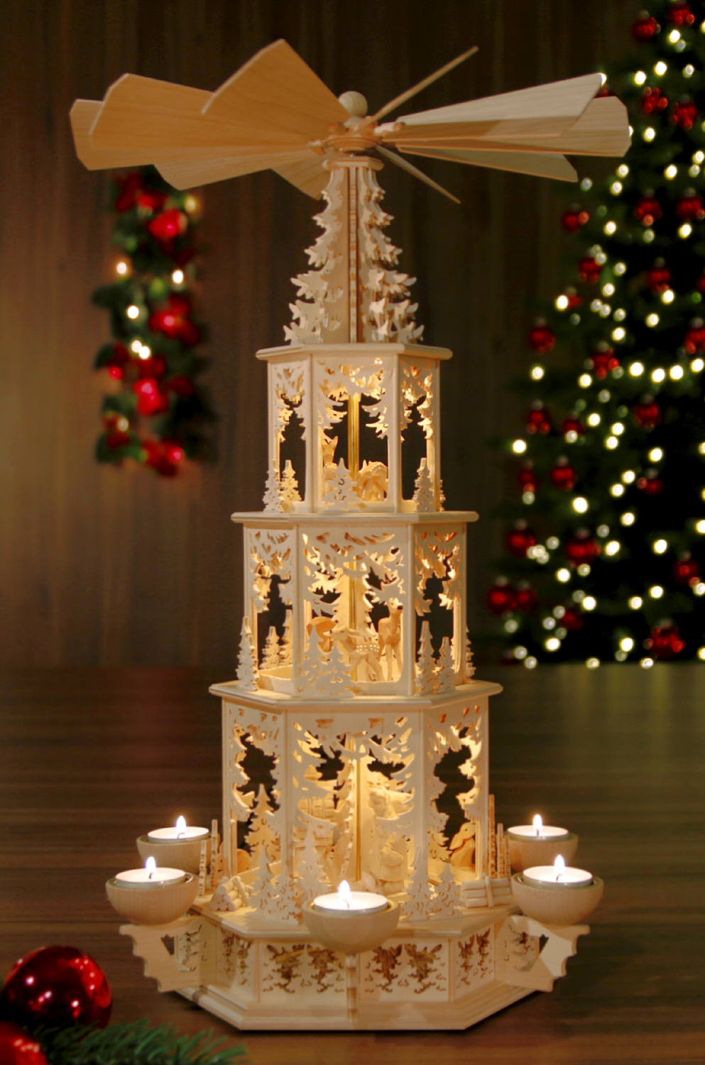 Mitten aus dem Weihnachtsland - Original aus dem Erzgebirge In unserer kleinen Werkstatt in Kurort Oberwiesenthal haben wir für Sie dieses Wald-Modell mit kleinen 3D-Effekten - einen filigranen Traum aus Holz - entwickelt und hergestellt. Diese 3-stöckige, 6-eckige Pyramide Höhe: ca. 53 cm wurde aus vielen Einzelteilen in liebevoller Handarbeit zusammengefügt. Komplettiert mit geschnitzten Figuren (Förster und Waldleute), niedlichen Häschen und exklusiv geschnitzter Rehfamilie (Rehbock, Ricke und Kitze) wird diese Pyramide die Advents- und Weihnachtszeit mit besonderer Romantik erfüllen. Die Figuren/Tiere sind auf der Pyramide fest verleimt. Technische Daten: Gesamthöhe: ca. 53 cm Diese Tilgner Weihnachtspyramide verfügt über eine langlebige, energiesparende Warmton-LED-Beleuchtung in allen 3 Etagen. Sie ist mit 6 Teelichthaltern ausgestattet, so dass die Pyramide durch die Wärme der Lichter angetrieben wird (ohne Motor!). Sind die Teelichter aus, dreht sich diese Pyramide nicht, verströmt aber durch ihre warme Beleuchtung eine wohlige Atmosphäre im Raum. Mit Steckernetzteil 12V (Eingang: 230V, Ausgang: 12V) Flügelraddurchmesser: ca. 33 cm Die aufwendige Verpackung stellt sicher, dass auf dem Transportweg nichts kaputt geht. - sofort lieferbar - Zurück zum Online-Shop | ||||||||